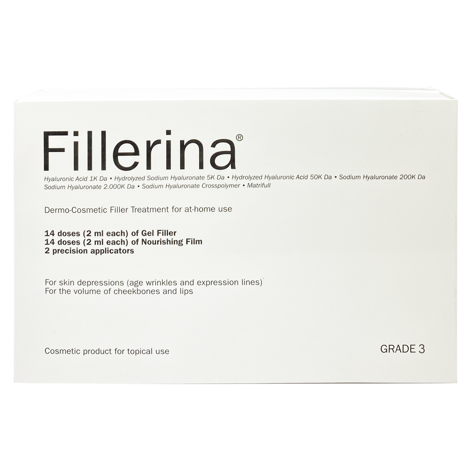 فيليرينا ديرمو كوزموتك فيلر علاجي درجة 3 فيليرينا ديرمو كوزموتك هو أول فيلر يمكن استخدامه في المنزل. ستحصلين على نتائج مذهلة بدون استخدام الإبر وبدون الشعور بأي ألم. تحتوي العلبة على قارورة جل تكفي لاستخدام 14 جرعة كل جرعة تكون بمقدار 2 مل وقارورة تحتوي على اللوشن المغذي تكفي لاستخدام 14 جرعة كل جرعة 2 مل. يحتوي الجل على حمض الهيالورنيك الذي يساعد على تقليل التجاعيد والخطوط التعبيرية كما أنه يحتوي أيضاً على الهيكساببتيد الذي يحفز إنتاج الكولاجين ويرطب البشرة. يحتوي اللوشن المغذي على فيتامين ه وفيتامين مضاد للأكسدة يعمل على حماية البشرة من الضرر الذي تسببه الجزيئات الحرة وزبدة الشيا التي تغذي وترطب البشرة بالإضافة إلى الزايليتول الذي يحسن من وظيفة الحاجز الواقي للبشرة. يحتوي اللوشن أيضاً على زيت بذور زهرة المروج الذي يمتلك خصائص مقاومة لعلامات التقدم في العمر مما يعمل على تقليل التجاعيد. يتوفر المنتج بثلاث تركيزات: التركيز الأول: للتجاعيد والخطوط التعبيرية الخفيفة. التركيز الثاني: للتجاعيد والخطوط التعبيرية العميقة. التركيز الثالث: للتجاعيد والخطوط التعبيرية العميقة جداً.