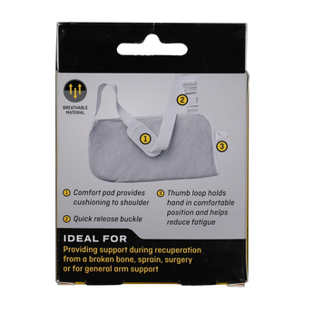 An adjustable, padded shoulder strap supports the arm area and locks it in place to reduce movement.