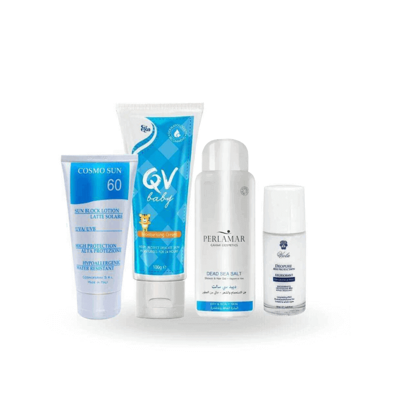 It comprises four products: Cosmo Sun 60 Sunblock Lotion, Viola Deodorant Fragrance-Free, Perlamar D.S Shower & Hair, and QV Baby Barrier Cream.